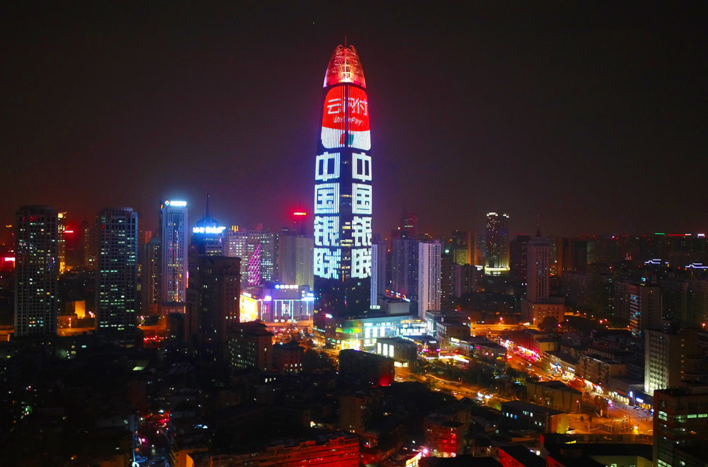 (中(zhōng)國(guó)銀聯投放“泉眼”齊魯國(guó)際大廈戶外LED屏廣告)